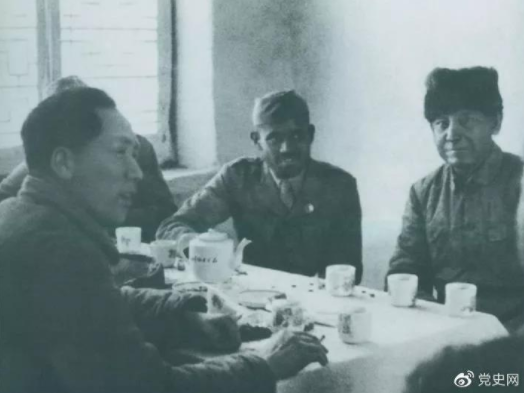 ▲1939年2月14日,毛澤東與印度援華醫(yī)療隊(duì)成員愛德華(右一)、柯棣華(右二)親切交談。