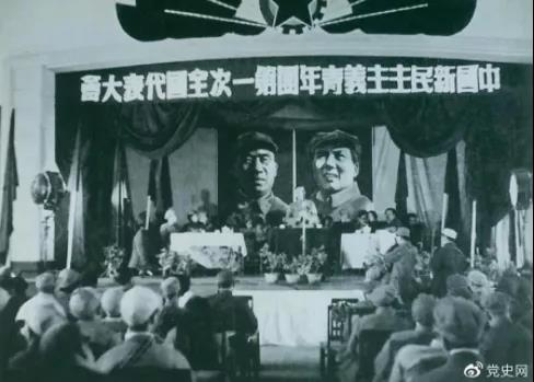 ▲1949411日,中國(guó)新民主主義青年團(tuán)第一次全國(guó)代表大會(huì)召開。圖為大會(huì)會(huì)場(chǎng)。