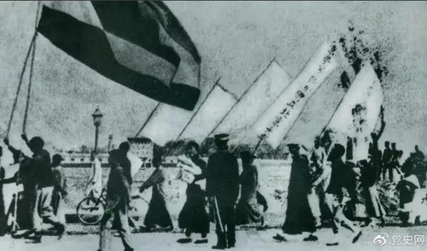 ▲1919年5月4日,北京爆發(fā)學(xué)生反帝愛國(guó)運(yùn)動(dòng)。這是北京大學(xué)學(xué)生的示威游行隊(duì)伍。