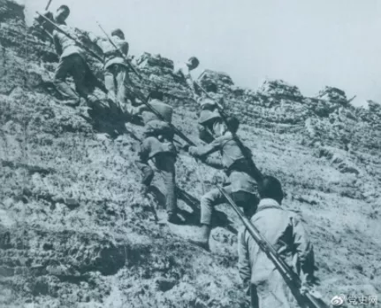 ▲1945年6月25日,八路軍冀中部隊攻克河北獻縣。圖為部隊奮勇攀登城墻。