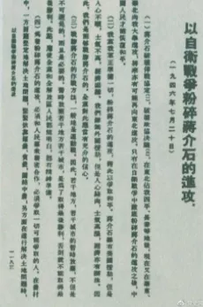 ▲1946年7月20日,中共中央向全黨發(fā)出《以自衛(wèi)戰(zhàn)爭粉碎蔣介石的進攻》的指示,號召全黨全軍樹立打敗蔣介石的信心,并規(guī)定了戰(zhàn)勝敵人的正確方針、原則和方法。圖為當時的報道。