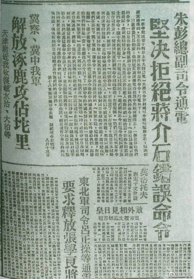 ▲1945813日,朱德、彭德懷致電蔣介石,嚴(yán)正駁斥蔣介石811日八路軍原地駐防待命,阻止八路軍受降的錯(cuò)誤命令,指出八路軍、新四軍理所當(dāng)然地有接受日本投降和分享抗戰(zhàn)果實(shí)的權(quán)利。圖為朱德、彭德懷給蔣介石的電文。