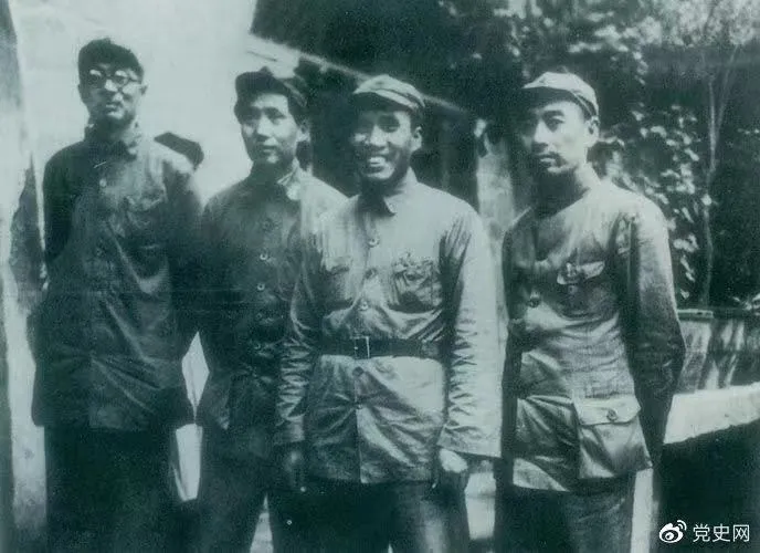 ▲1937822日至25日,中共中央在陜北洛川馮家村舉行政治局?jǐn)U大會議(即洛川會議)。圖為毛澤東和朱德、周恩來、林伯渠的合影。