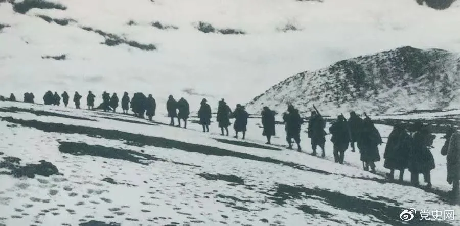 ▲1950年3月,人民解放軍開始向西藏進軍,10月6日至24日進行了昌都戰(zhàn)役,攻占昌都,打開了進軍西藏的大門,為和平解放西藏奠定了基礎。圖為迂回昌都南路的人民解放軍行進在海拔5000米的怒山山脈雪嶺上。