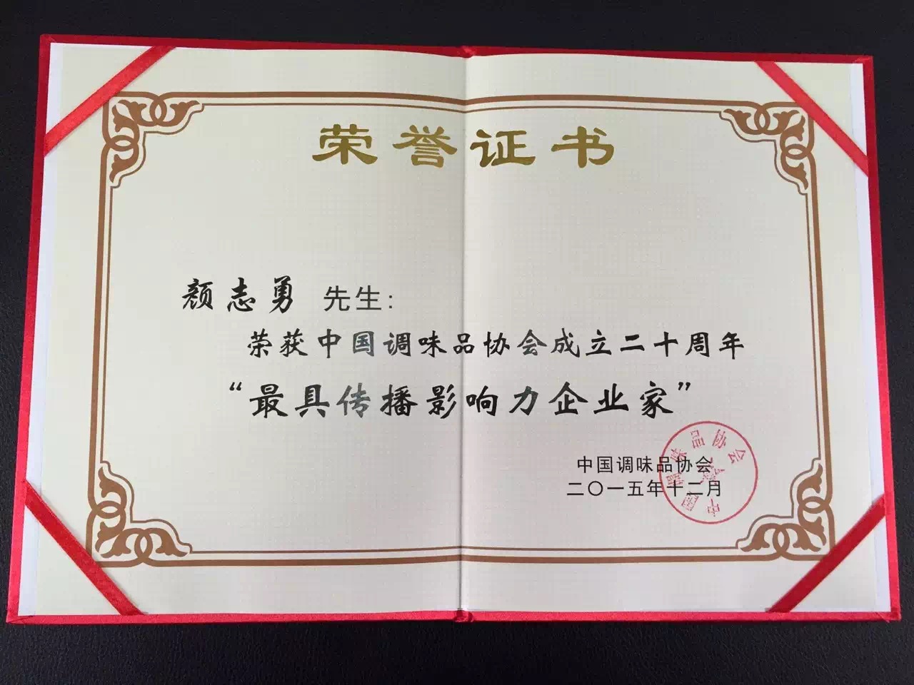 近期,公司董事長顏志勇榮獲由中國調(diào)味品協(xié)會授予的中國調(diào)味品協(xié)會成立二十周年“最具傳播影響力企業(yè)家”稱號。