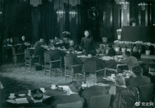 1949年10月21日,周恩來主持召開中央人民政府政務(wù)院第一次會議。正面左起:陳云、董必武、周恩來、郭沫若、黃炎培。