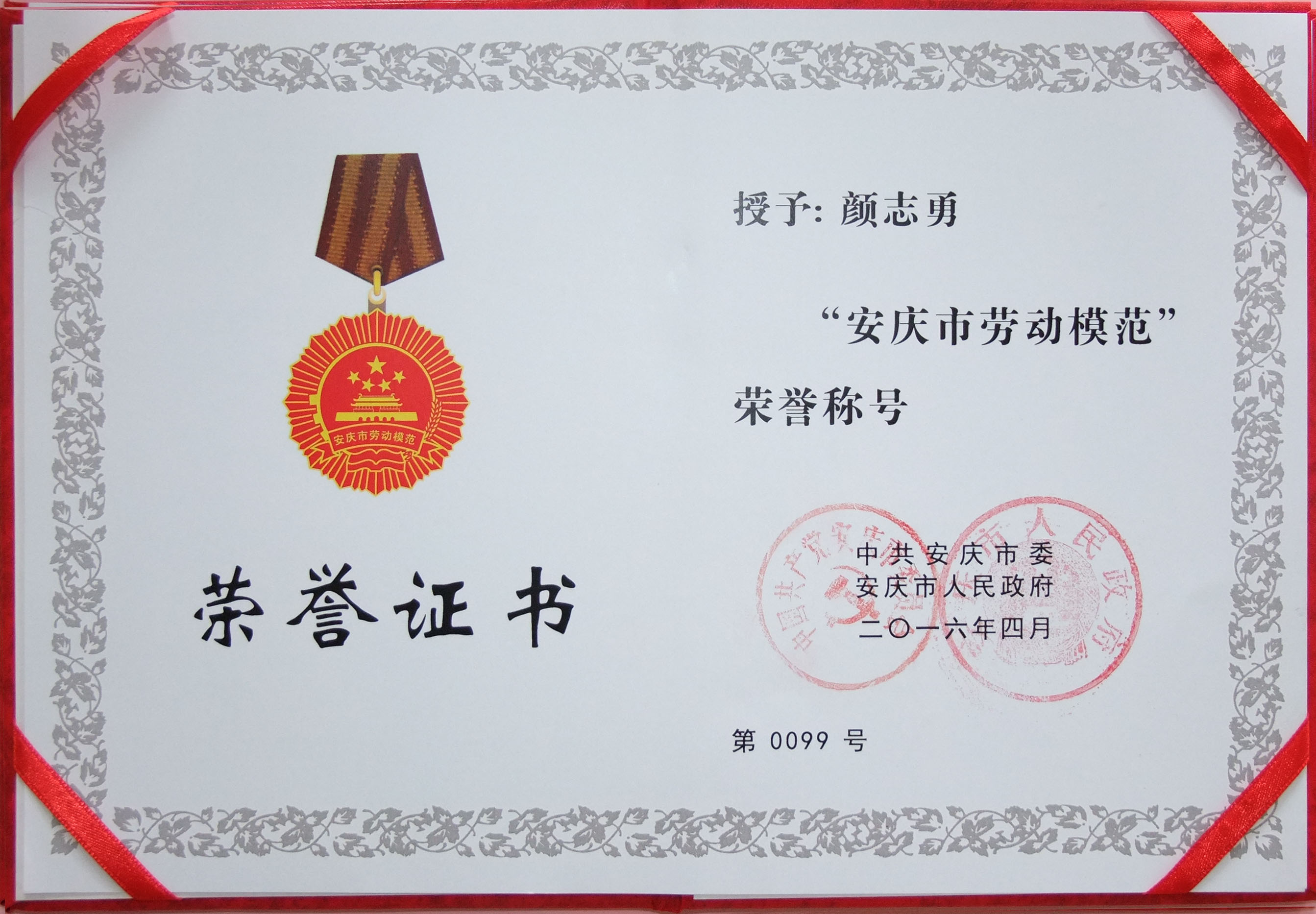 4月26日,為大力弘揚勞模精神、勞動精神,打贏安慶“五大攻堅戰(zhàn)”匯聚強大正能量,2016年安慶市勞動模范先進工作者和先進集體表彰大會在市政府會務(wù)中心隆重召開。市委書記魏曉明出席會議并講話,代市長陳冰冰主持會議。我公司董事長顏志勇位列其中,榮膺“安慶市勞動模范”榮譽稱號。