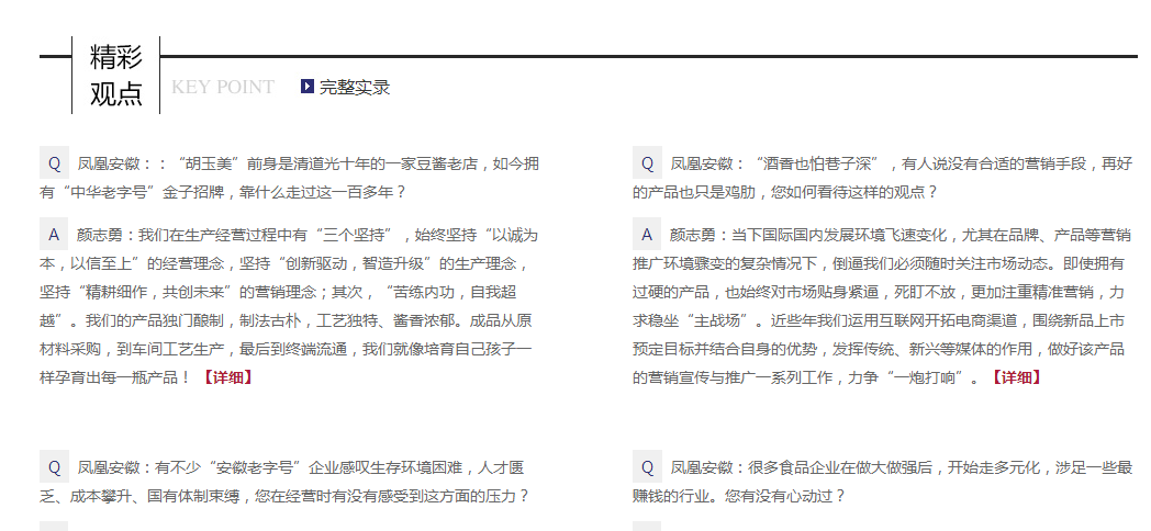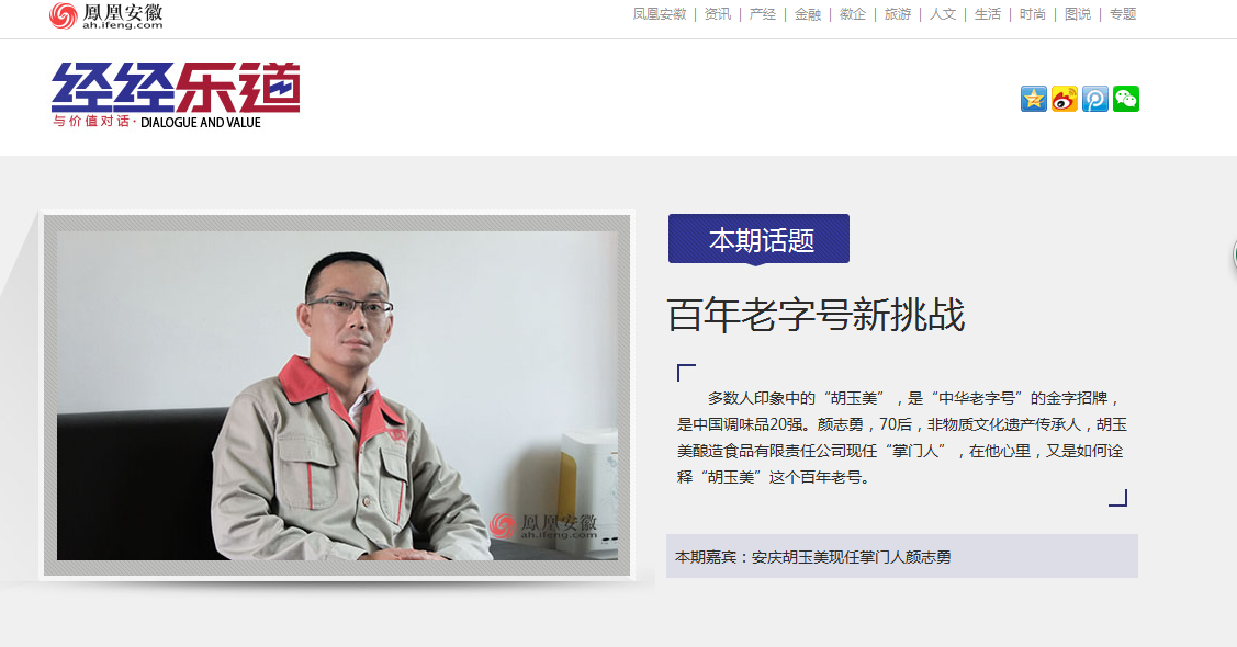 近日,公司董事長顏志勇接受鳳凰網(wǎng)記者專訪。專訪以“胡玉美”百年老號(hào)新挑戰(zhàn)為主線,就“胡玉美”品牌歷史傳承、產(chǎn)品營銷策略、企業(yè)發(fā)展現(xiàn)狀、食品安全問題、產(chǎn)業(yè)多元擴(kuò)張、未來規(guī)劃猜想等話題展開對(duì)話。(辦 宣)