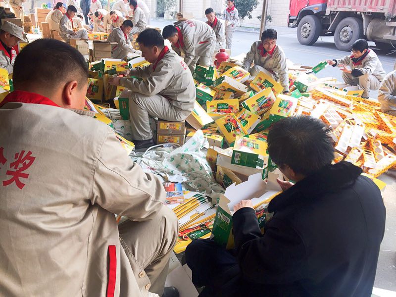 元旦期間,公司全體營(yíng)銷人員放棄假期休息時(shí)間,為新年大單禮盒裝箱上車工作全力以赴。(辦 宣)