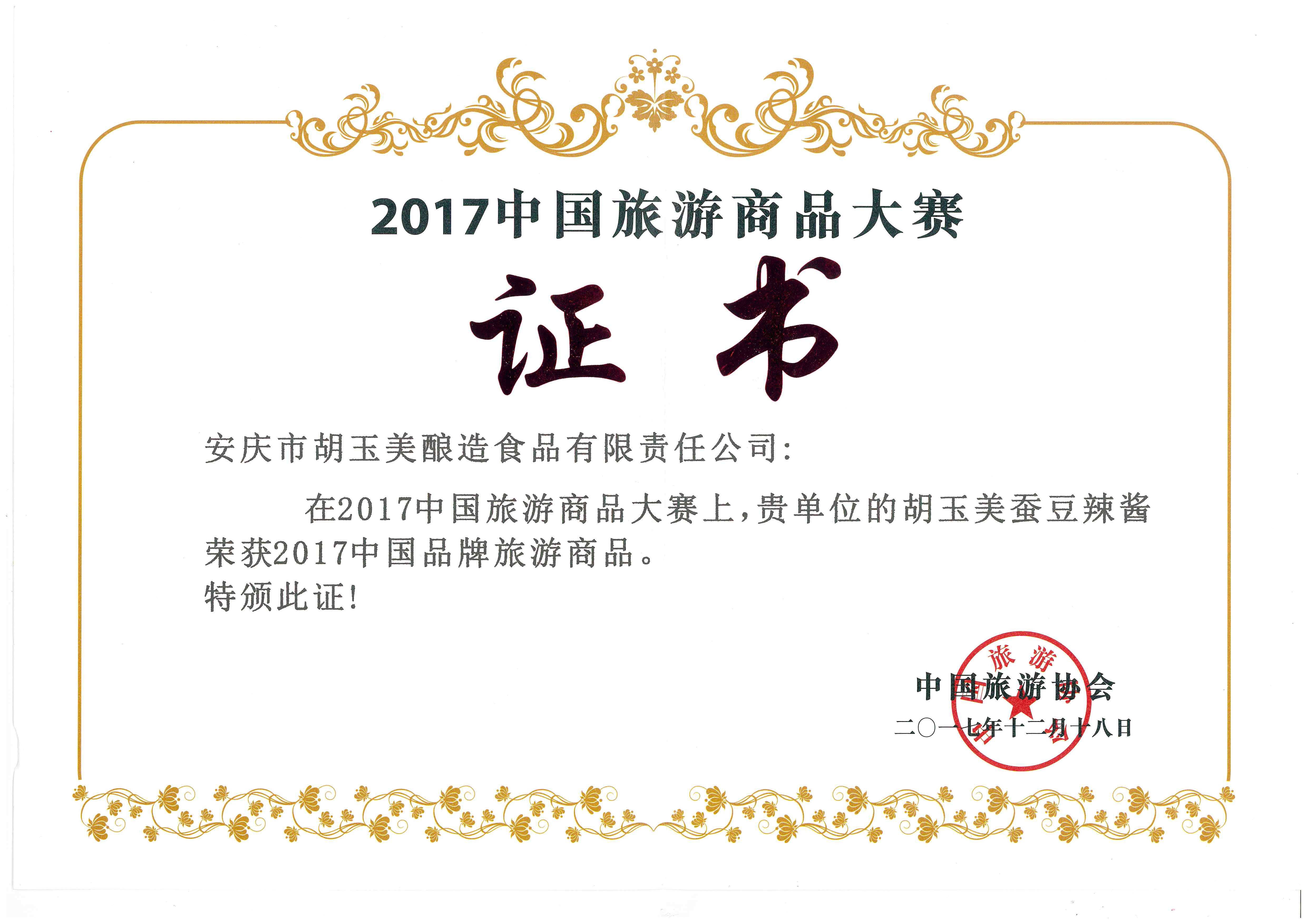 2017年末,由中國旅游協(xié)會(huì)主辦的“2017中國旅游商品大賽”頒獎(jiǎng)典禮在??谂e行,公司參賽作品“胡玉美蠶豆辣醬”榮獲“2017中國品牌旅游商品”稱號(hào)。據(jù)了解,在國家旅游局和中國旅游協(xié)會(huì)共同支持下,中國旅游商品大賽已成功舉辦八屆,現(xiàn)已成為中國旅游商品設(shè)計(jì)開發(fā)的方向標(biāo),引領(lǐng)旅游商品設(shè)計(jì)開發(fā)的潮流趨勢。在本屆大賽上,安慶市僅有三個(gè)參賽作品獲此殊榮。