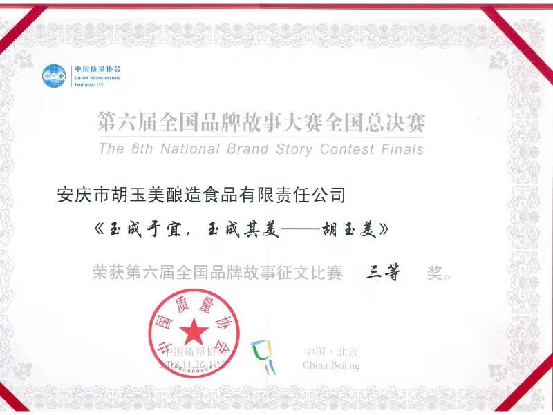 11月27日下午,第六屆全國品牌故事大賽總決賽頒獎典禮在北京會議中心落下帷幕。在安慶市工商行政和質(zhì)量技術(shù)監(jiān)督管理局的組織安排與安慶市經(jīng)濟和信息化委員會的關(guān)心支持下,“胡玉美”公司征文《玉成于宜,玉成其美——胡玉美》代表安徽省企業(yè)被推選參加并榮獲征文組三等獎。據(jù)悉,本次征文組中安徽省獲獎企業(yè)僅四家。